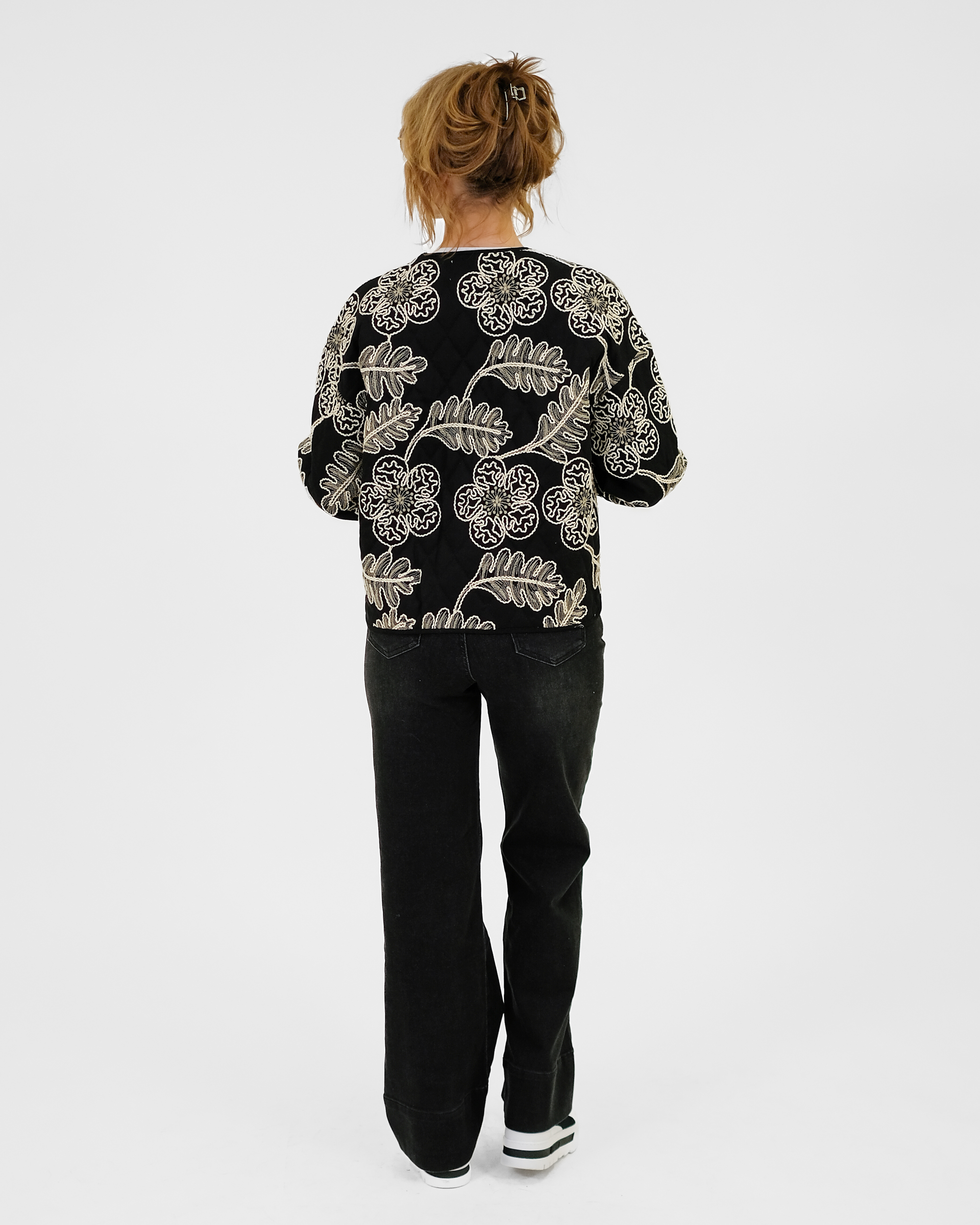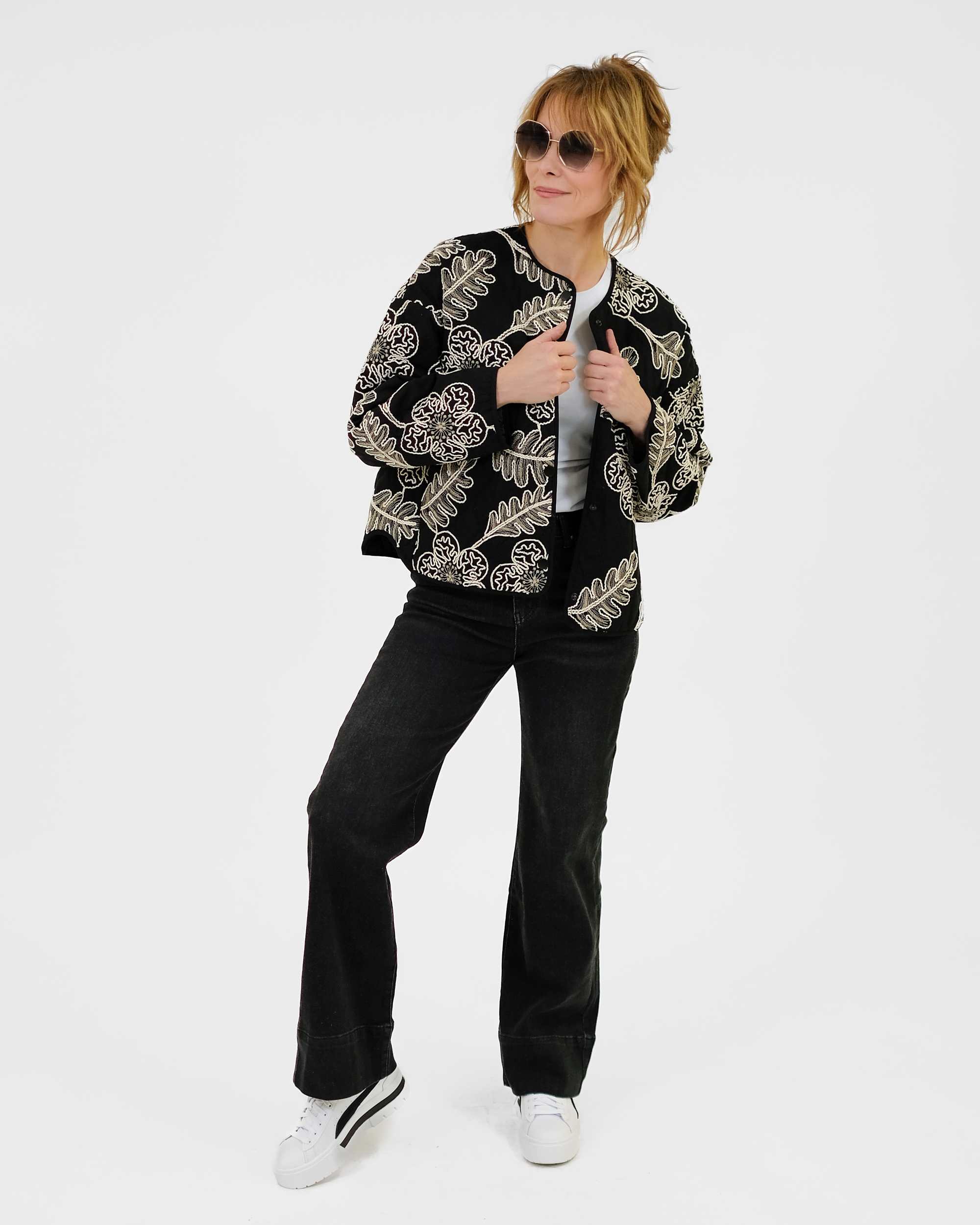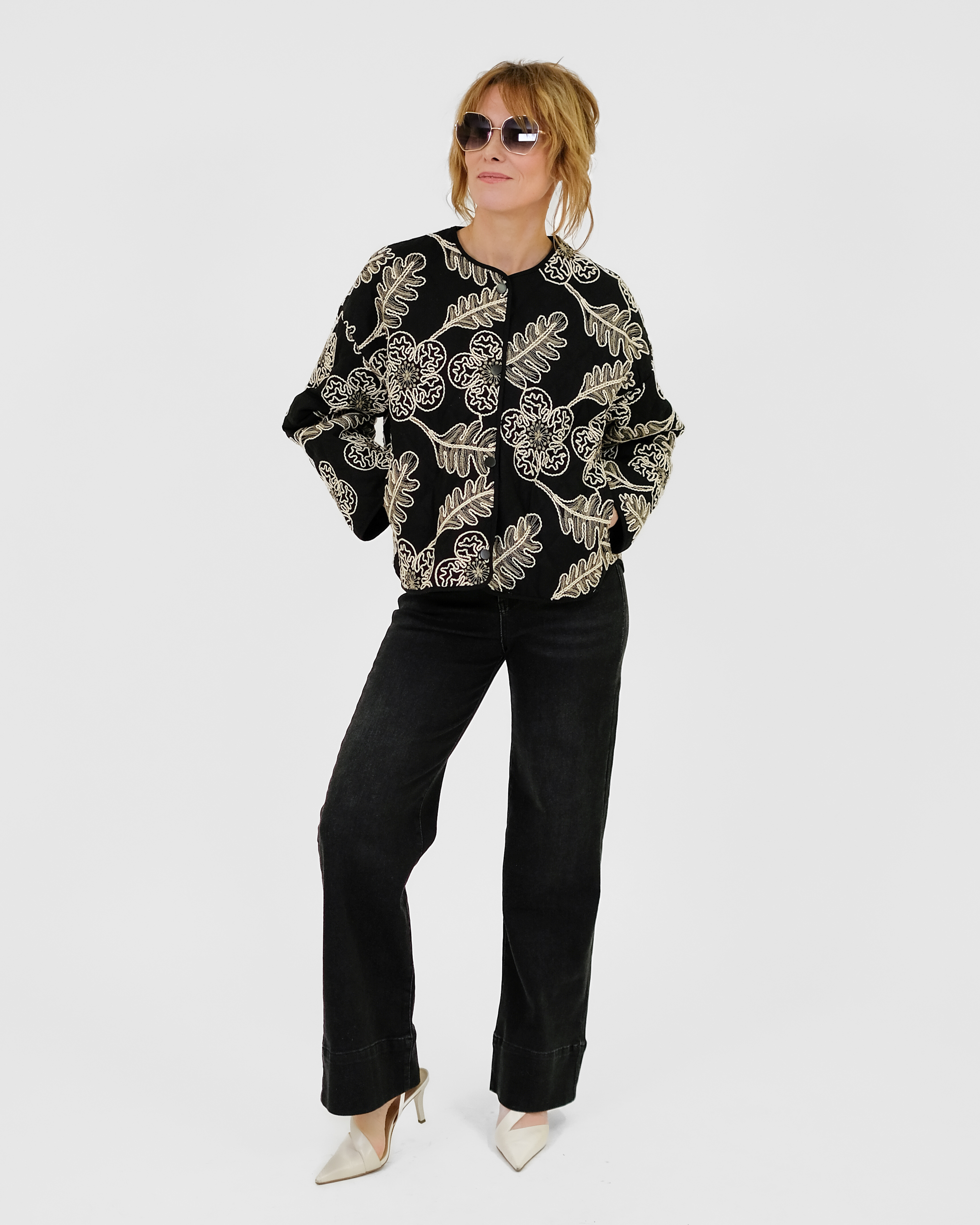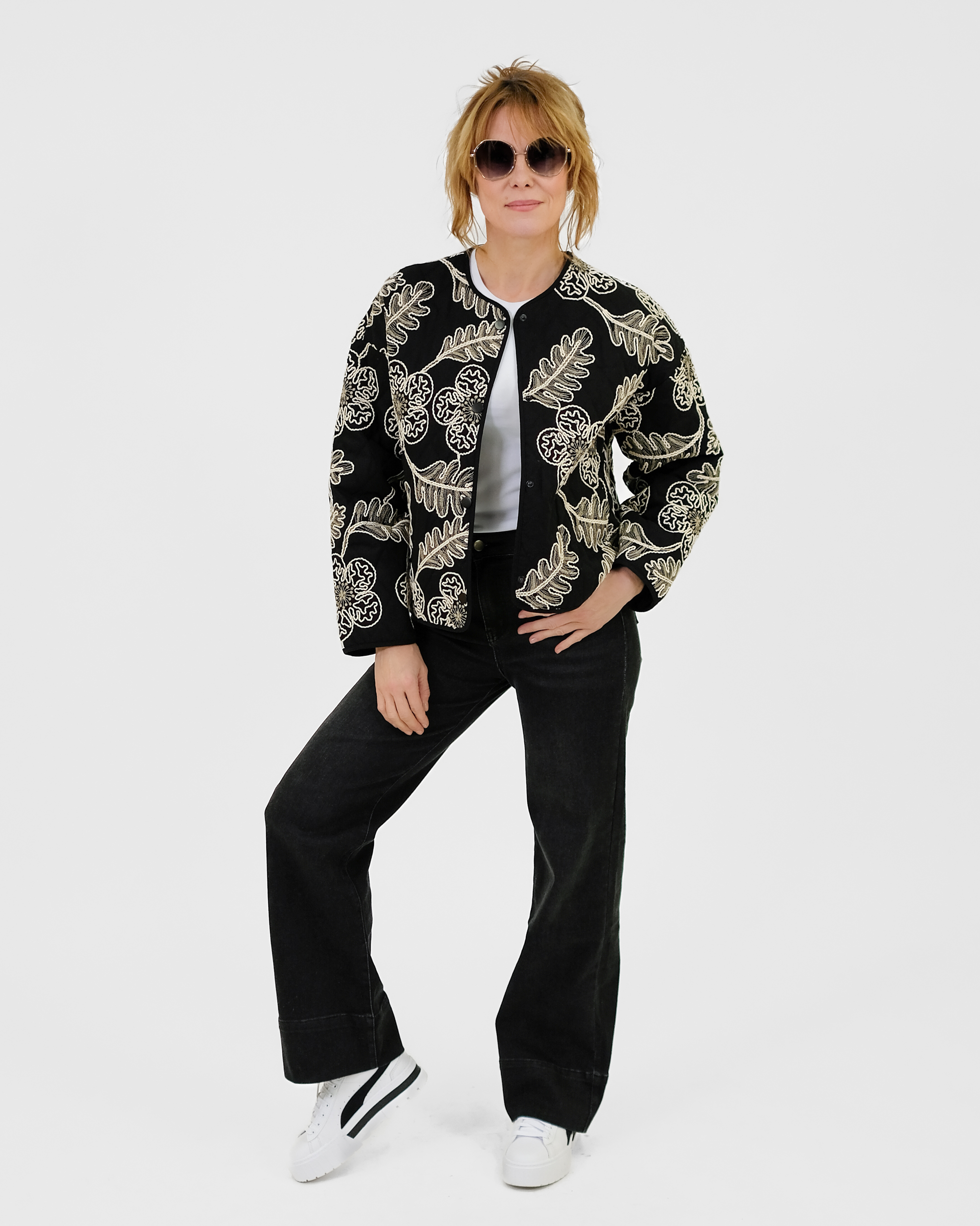 Laialõikeline tepitud jakk on trukkidega. Jakil on taskud.