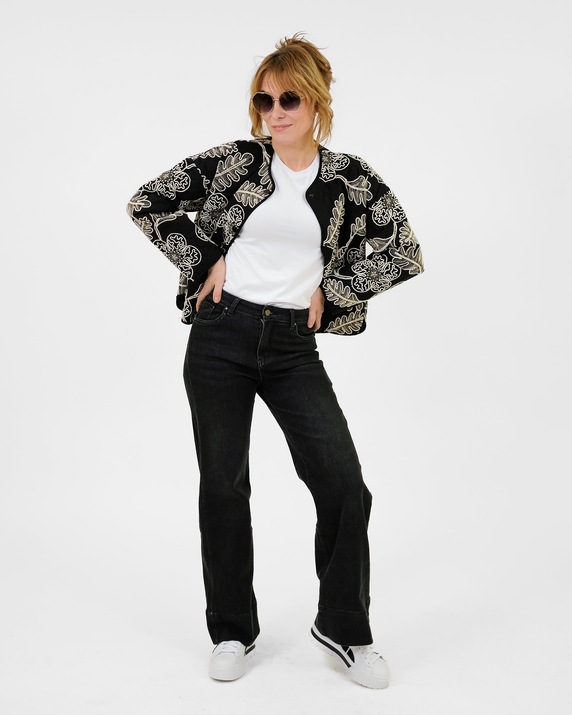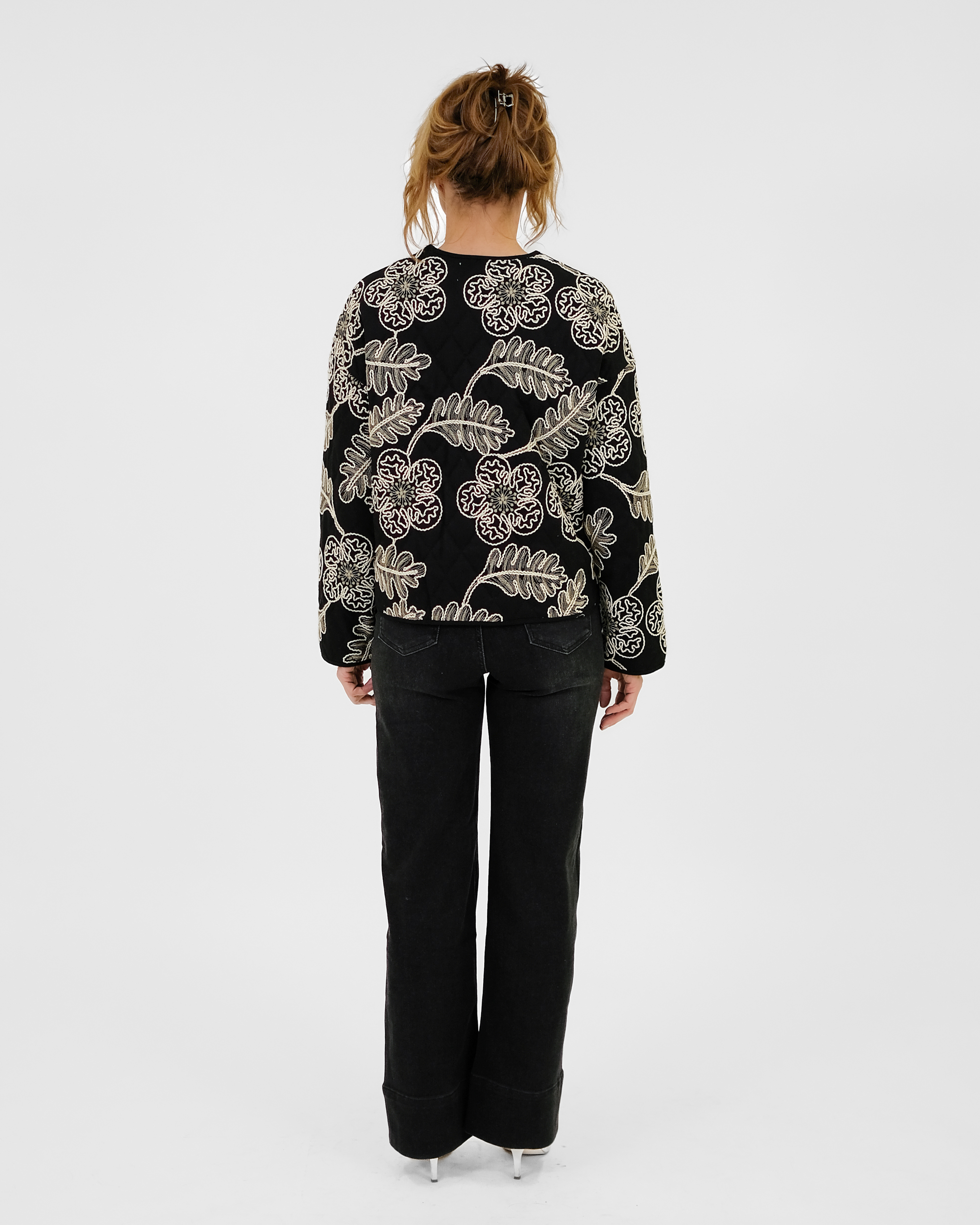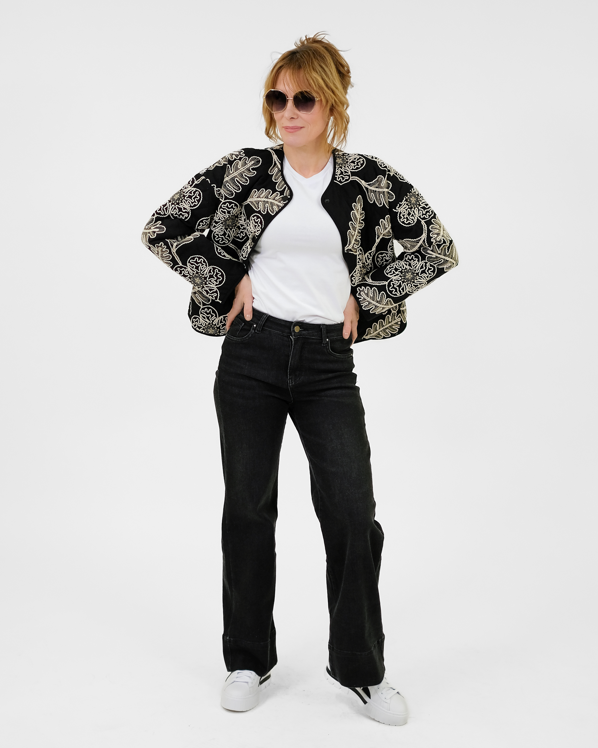 Laialõikeline tepitud jakk on trukkidega. Jakil on taskud.