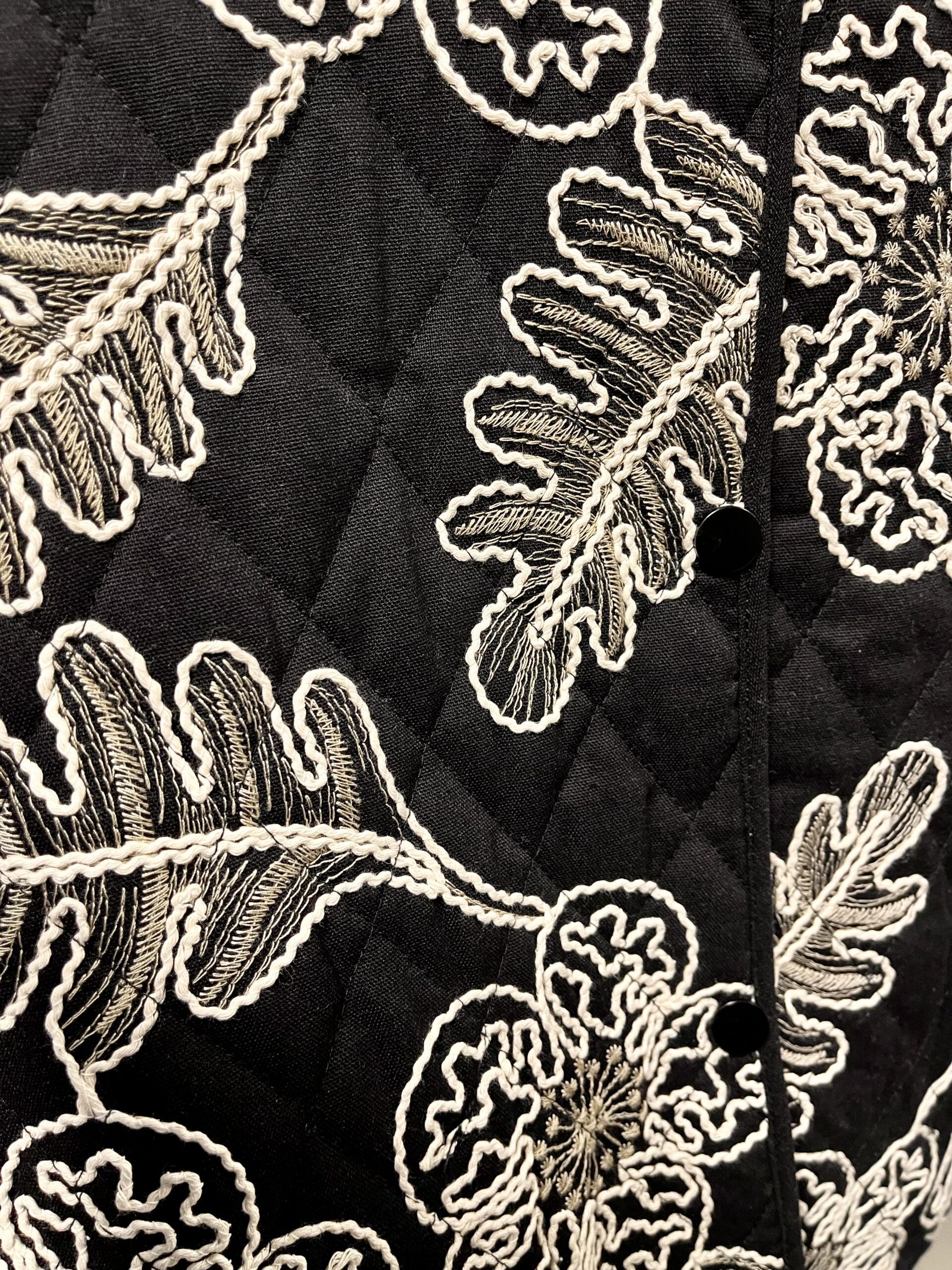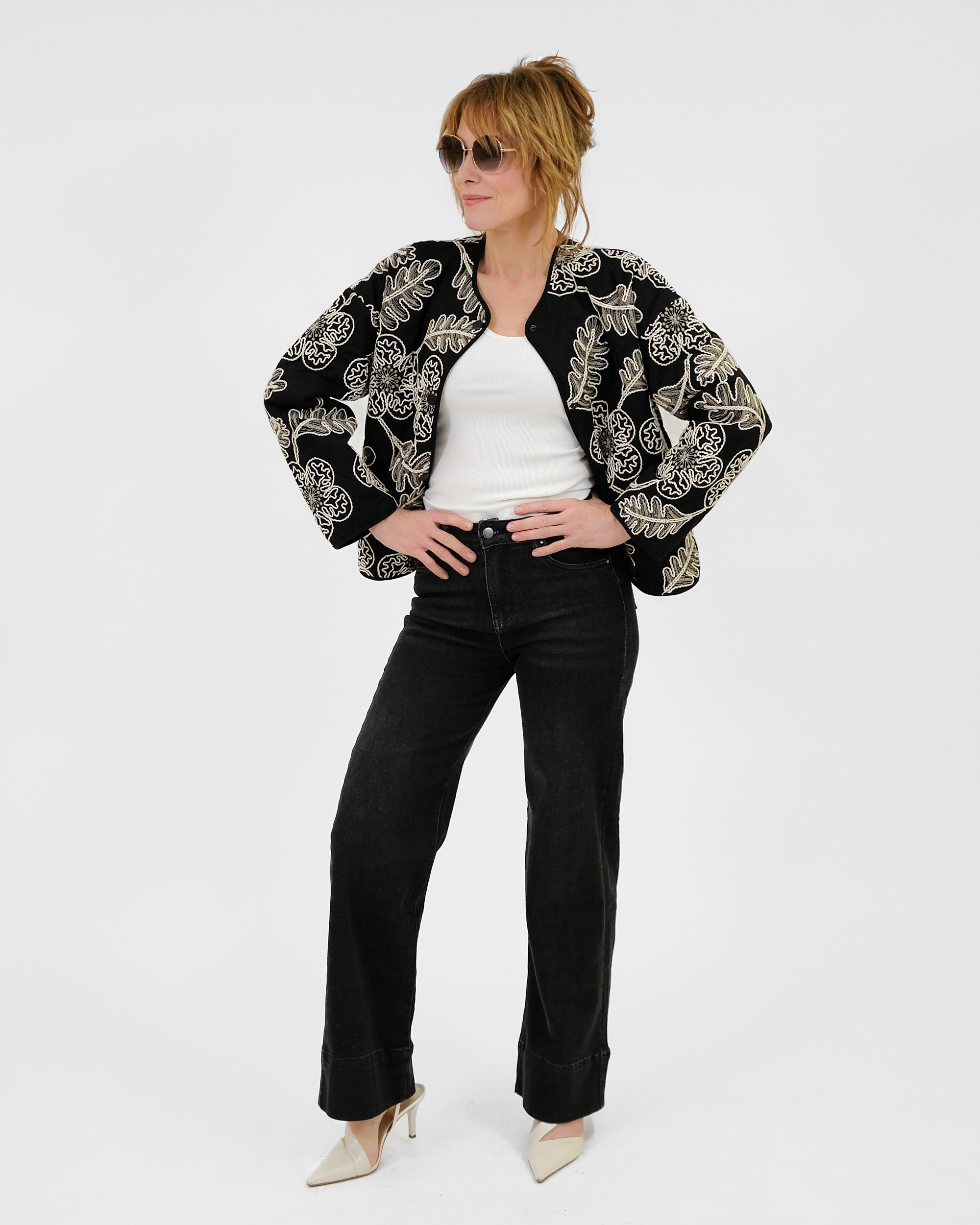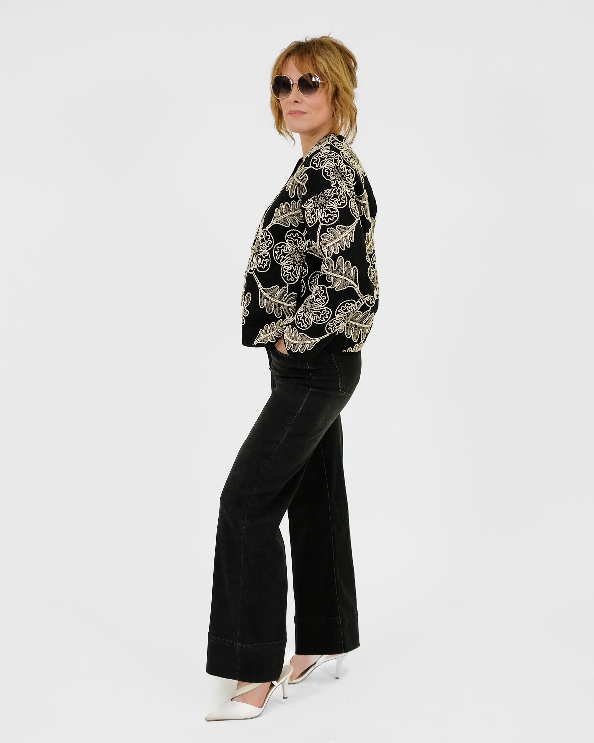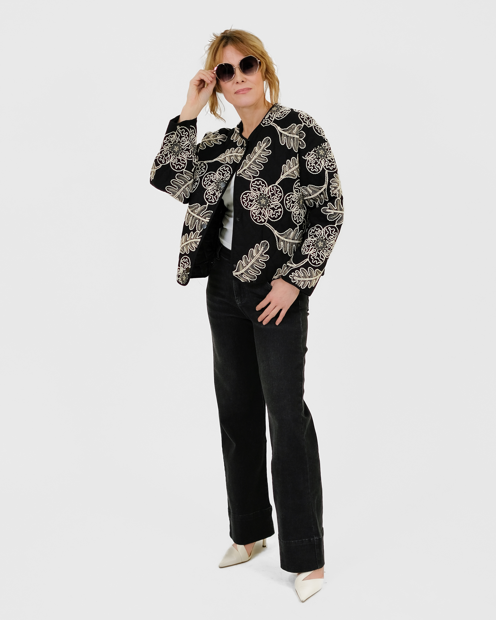 Laialõikeline tepitud jakk on trukkidega. Jakil on taskud.